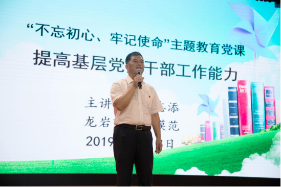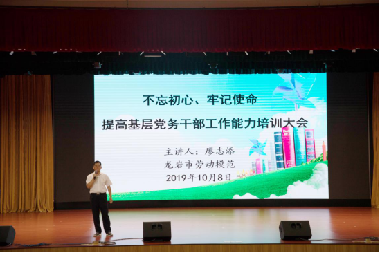 为提高基层党务干部工作能力,10月8日下午,MG冰球在大匠堂开展“不忘初心、牢记使命”主题教育党课,特邀龙岩市劳动模范廖志添同志为全校党老师上题为《提高基层党务干部工作能力》的党课。会议由校党委副书记李贞鑫主持。