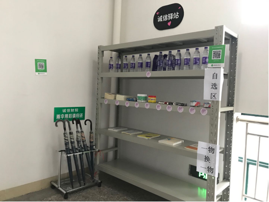 “诚信驿站”由财经商贸学院志愿者创立、运营,本着“内诚于心,外信于人”的理念,用一个无人收银,无人监控的售货平台来宣扬诚信,培养诚信习惯,打造诚信品格,形成诚信校风。