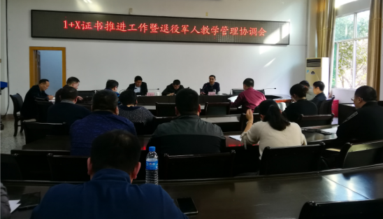 12月25日下午,“1+X”证书制度试点工作推进暨退役军人教学管理协调会在办公楼第一会议室召开。党委书记卢伟耀、校长郑志强、副校长吴新业出席了,教务处负责人、各二级学院(系)相关负责人参加了会议。郑志强主持会议。