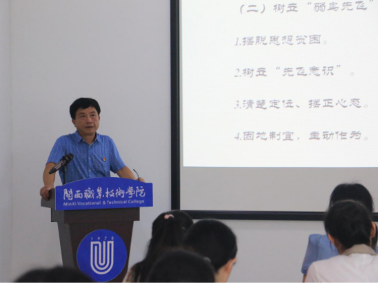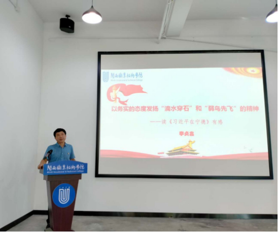 活动在中闽大红教室进行,校党委副书记李贞鑫以《以务实的态度发扬“滴水穿石”和“弱鸟先飞”的精神——读〈习近平在宁德〉有感》为题上了党课,他围绕《习近平在宁德》中“滴水穿石”和“弱鸟先飞”提出的背景、内涵,阐释了“闽东精神”的意义、启示,并针对当前MG冰球改革发展提出:一要坚定“滴水穿石”执著,坚持踏实行事,谋长远发展;二是锤炼实干作风,树立“弱鸟先飞”意识,摆脱思想贫困,发挥自身优势,主动担当作为。最后他以习近平近日给复旦大学《共产党宣言》展示馆党员志愿服务队全体队员回信中的话“在学思践悟中坚定理想信念,在奋发有为中践行初心使命”勉励大家踏实勤奋工作。