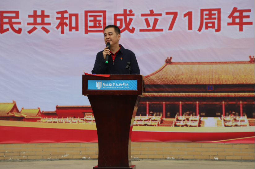 卢伟耀说,站在鲜艳的五星红旗下,立足新中国成立71周年的新起点,面对世界百年未有之大变局,面对党和国家更高的期待,我们要不忘初心、牢记使命,永远奋斗!广大教师要不忘立德树人初心,牢记为党育人、为国育才使命,始终做坚定的马克思主义者;青年学生们要积极践行社会主义核心价值观,保持奋斗姿态、练就过硬本领,做中国特色社会主义建设者和接班人,为实现中华民族伟大复兴不懈奋斗。