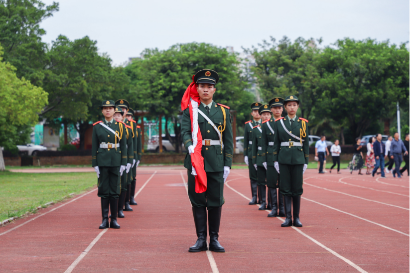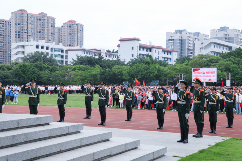 上午8时30分,在铿锵有力、整齐划一的脚步声中,国旗仪仗队来到升旗台前护卫国旗。《义勇军进行曲》响起,五星红旗冉冉升起。在场领导及全校师生庄严站立,面向五星红旗高唱国歌,激情澎湃。