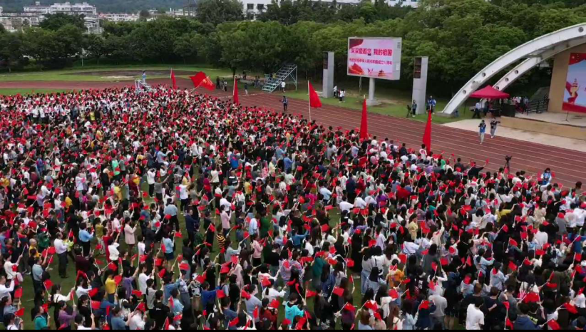 全场师生-挥舞手中的国旗,共同唱响《歌唱祖国》,“歌唱我们亲爱的祖国,从今走向富强”,以歌言志,抒发爱国情、报国志。