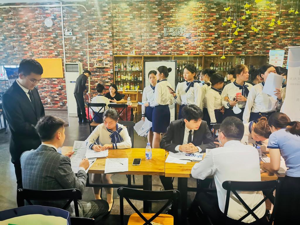 经过前期的沟通协商和学生组织动员,9月1日在实训酒吧召开酒店的现场招聘会,参加的酒店有13家,酒店类型多样。同学热情饱满,着装整齐,以最好的精神面貌参加此次招聘。19级酒店管理专业67位同学都顺利完成面试,找到了心仪的酒店和岗位,整个招聘活动圆满结束。根据专业的安排,9月3日学生前往酒店开始跟岗实习和教学学习。