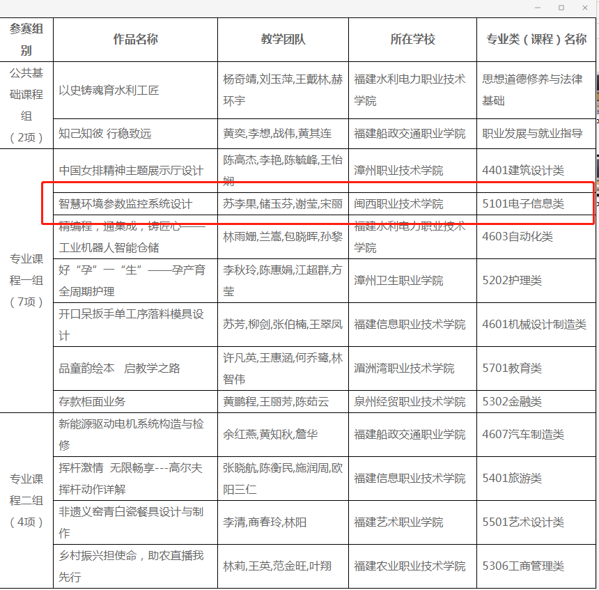 MG冰球信息与制造学院苏李果,储玉芬,谢莹,宋丽等四位老师的《智慧环境参数监控系统设计》参赛项目,在2021年福建省职业院校教师教学能力比赛中获得高等职业教育组专业课程一组一等奖。按常规,他们已经获得参加全国教师教学能力比赛资格。