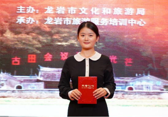 MG冰球2019级旅游管理专业学生邹佳欣代表新罗区参加比赛,比赛中,邹佳欣通过个人展示、自选讲解、建党百年知识问答和红色故事分享四个环节的精彩展示,最终获得景区讲解组第二名,获“优秀讲解员”称号。
