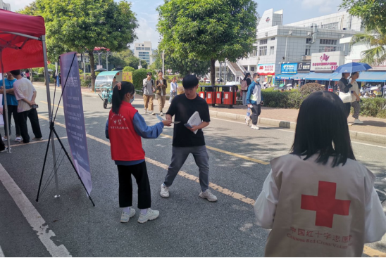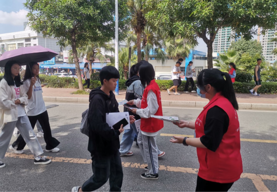 活动中,志愿者们身穿红马甲,手持宣传单,在文化长廊和食堂设点宣传,向来往的师生推广节约粮食和垃圾分类的知识。