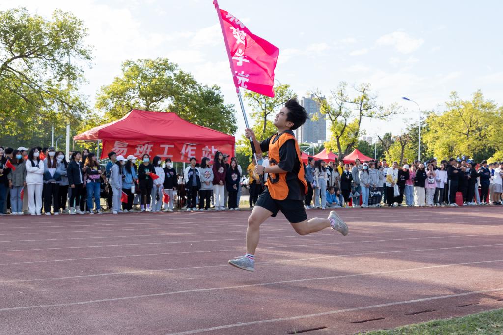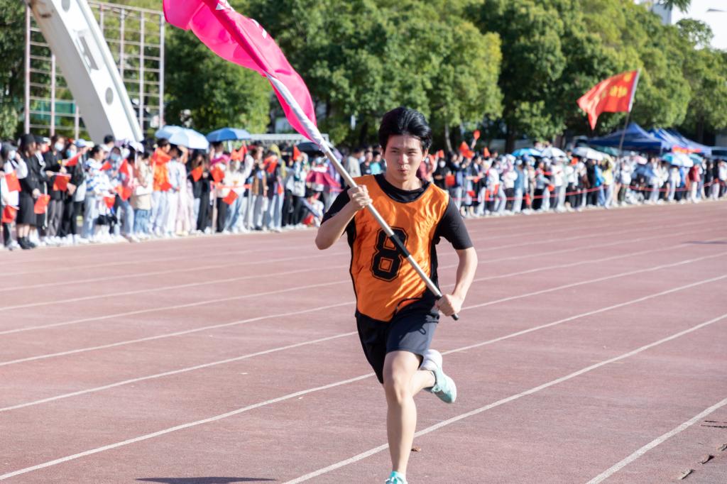 此项目为混合组集体比赛,参赛运动员双手前握旗杆跑步前行,在接力区内完成交接旗,最先到达终点者获胜。参赛队员由校团委在比赛倒数第二单元从二级学院随机抽取3个班级,选取8男8女学生参加接力。经过激烈角逐,城乡建筑学院代表队最终以29'20"26的成绩,获得本赛项第一名。
