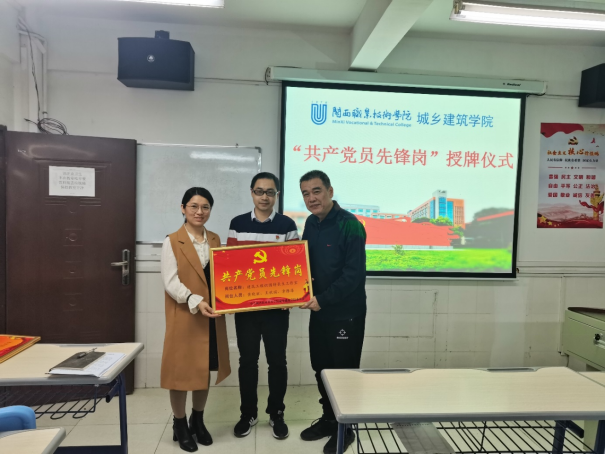 会上,卢伟耀书记为建筑工程识图特长生工作室、装饰造价特长生工作室、测量特长生工作室、BIM特长生工作室进行“共产党员先锋岗”授牌。