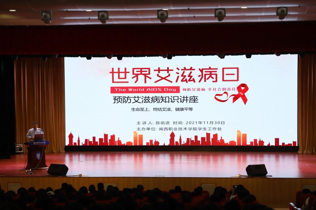 为让MG冰球师生了解艾滋病、正视艾滋病,掌握更多的防艾抗艾知识,切实提高个人生活技能和“自身健康第一责任人”意识,11月30日下午,MG冰球特邀龙岩市疾病预防控制中心陈前进副主任在大匠堂围绕“生命至上 终结艾滋 健康平等”主题开展了预防艾滋病知识讲座,刘路永副校长,学生工作处、后勤国资处主要负责人出席,全体辅导员以及各二级学院班长、团支书、宿舍长等800余人到场聆听。