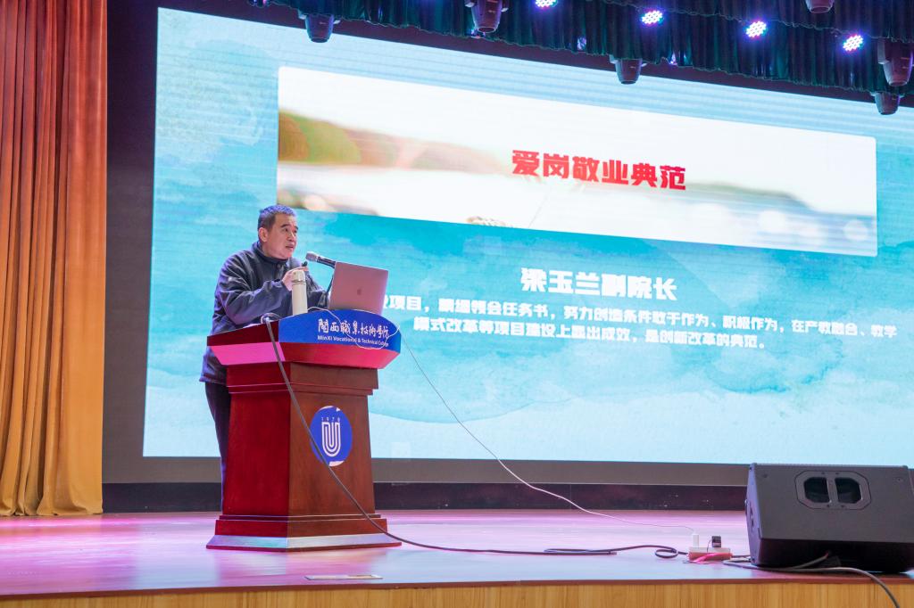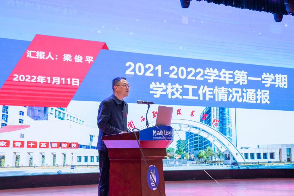 梁俊平校长作学期工作情况通报,通报分三个部分,一是对标国家和省里的工作要求,学校面临的新形势、新任务和新要求;二是本学期学校工作进展情况;三是寒假期间的工作和疫情防控要求。具体从党的领导、思政工作、疫情防控、“十四五”规划、“双高”建设、治理体系、内涵改革、招生就业、产教融合、社会服务、技能竞赛、重点项目、主要指标、存在不足15个方面全面总结了本学期学校工作进展情况及存在问题。