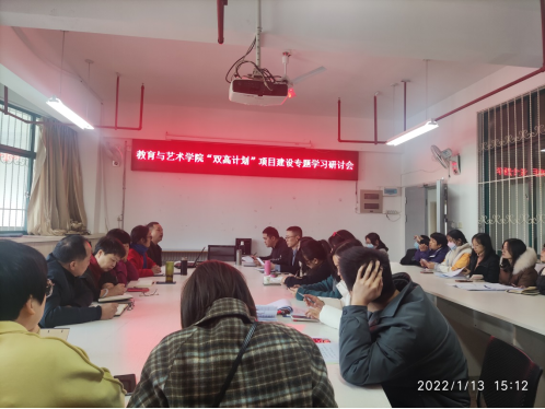 近日来,教育与艺术学院按照校党委的安排部署,组织全院教职员工深入开展“聚焦建功有我、奋力创建双高”专题学习研讨活动。1月12日开展“双高计划”项目建设专题学习活动,13日开展学习研讨会议,在教职员工中解放思想、形成共识,紧紧围绕重点建设任务,深入查摆建设推进过程中的问题和不足,解难题、补短板、求突破,倡议教职员工结合自身岗位和个人规划发展,认真思考“我为‘双高计划’出谋划策”“我能为‘双高计划’做什么”。主动融入省级高水平职业院校和高水平专业群建设,加快实现学校高质量发展。