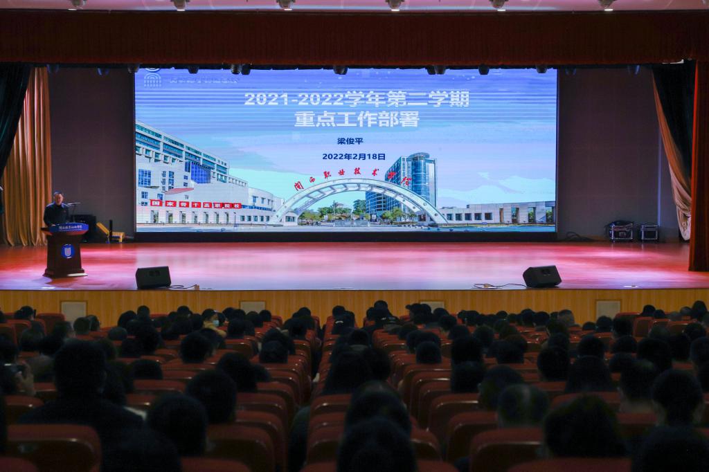 他强调,今年的重点工作有12项,分成4个大项、8个深化。4个大项为:一是深入实施“十四五规划”“双高计划”建设;二是全面加强党的建设;三是合力攻坚产教融合行动计划;四是提质创建省级文明校园。8个深化为:深化专业发展与人才培养模式改革,深化科研工作和提升服务能力,深化教师队伍建设,深化学生思政团学工作,深化招生就业创业工作,深化基建项目建设,深化信息化建设,深化安全稳定工作。