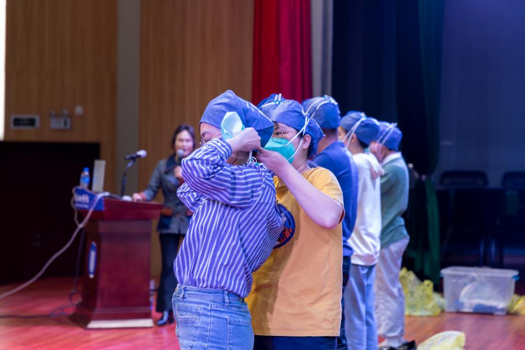 周志鹏医师从当前疫情形势、个人防护要求、出现疫情校园应急处置等方面进行了详细讲解。曾菊香医师与现场6名师生一道,完整演示并指导二级防护服规范的穿脱程序。