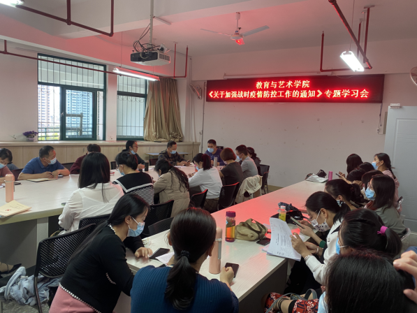 根据学校《关于加强战时疫情防控工作的通知》要求,教育与艺术学院党委高度重视,按文件规定要求,结合实际,2022年3月21日下午召开党委会和党政联席会议认真学习传达《关于加强战时疫情防控工作的通知》精神。22日,全院教职工集中学习习近平总书记在中央政治局常委会上分析新冠肺炎疫情形势部署从严抓好疫情防控工作的重要讲话精神,贯彻落实全省、全市教育系统疫情防控系列会议和学校疫情防控工作会议精神,逐句解读《关于加强战时疫情防控工作的通知》,落实学校新冠肺炎疫情应急处置实战演练方案的关键点,分工到人;各党支部召开党员大会(非党员教职工列席)认真开展学习、讨论。通过召开不同层面疫情防控专题学习会,深入学习贯彻各级疫情防控系列会议和学校疫情防控工作会议精神,主动梳理查找上次疫情防控中存在的不足,进一步明确单位、个人在战时疫情防控工作中的职责和要求;要求全体教职工切实提高政治站位,认清当前疫情防控形势,时刻保持清醒、慎终如始,坚决克服“松口气、歇歇脚、等等看”和麻痹大意的思想,把思想和行动统一到党中央、国务院和省委、市委、学校党委的决策部署上来。