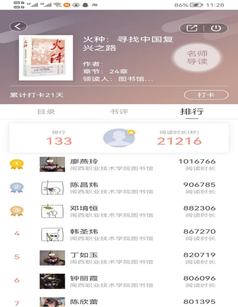 《火种——寻找中国复兴之路》为这次共读打卡的书目,活动在线上线下同步宣传推广,读者线上阅读打卡,进行评论,评选出阅读之星10名,阅读达人10名,优秀书评5篇。通过共读打卡评论《火种——寻找中国复兴之路》这本书,让读者了解在历史的纷繁复杂中,共产党人如何应对国际与国内、外部与内部矛盾,找到适合自己生存、发展的道路,明确“只有共产党才能救中国”这一颠扑不破的真理。