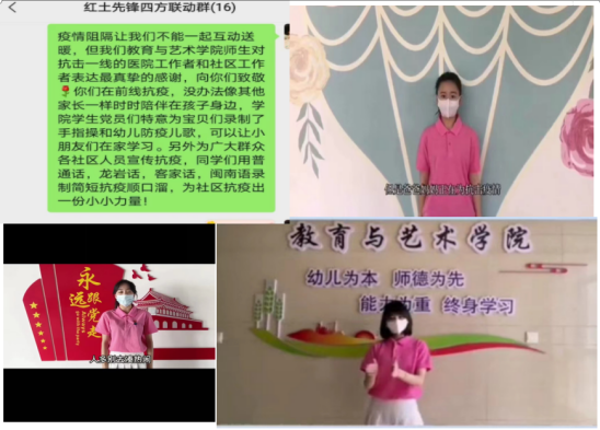 疫情时期,教育与艺术学院红土先锋党员工作室的学生党员志愿者利用专业知识,为抗疫一线的医护人员子女和社区居民录制抗疫儿歌、手指谣和抗疫知识顺口溜等,在抗疫中贡献自己的一份力量。