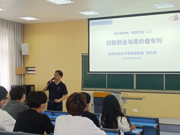 2022年4月26日下午,MG冰球突破官网在望云楼阶梯教室举办主题为“创新创业与高价值专利”的专题讲座,主讲人张松梅老师为全国财政职业教育第四届和第五届行指委委员、福建省工信厅项目评审专家库成员、《龙岩市新材料产业专利导航服务基地建设研究》课题组组长、校宣讲团成员。