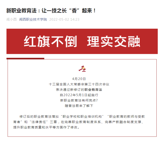 5月2日率先开展线上宣传活动,在校官微发布《新职业教育法:让一技之长“香”起来!》文章,对本次新修订的职业教育法进行介绍,增进全体师生对新职业教育的认识。