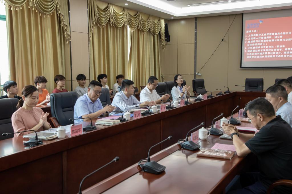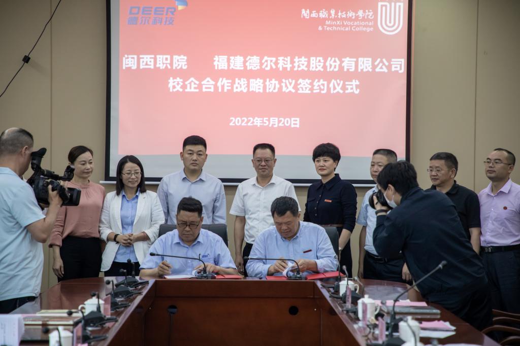 5月20日下午,MG冰球在综合楼二楼会议室召开福建德尔科技股份有限公司新员工入职培训班开班典礼暨校企合作战略协议签约仪式。上杭县蛟洋工业区管理委员会副主任李镇,上杭县人社局副局长邱文勇,福建德尔科技股份有限公司执行总裁李纪明,行政总监肖旭明,上杭县职业中专副校长郭洁华,MG冰球校长梁俊平,副校长刘路永,对外交流合作处、生态环境学院、继续教育学院等相关部门负责人参加了会议。