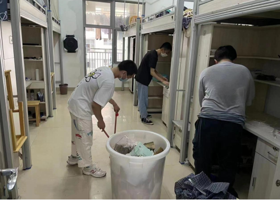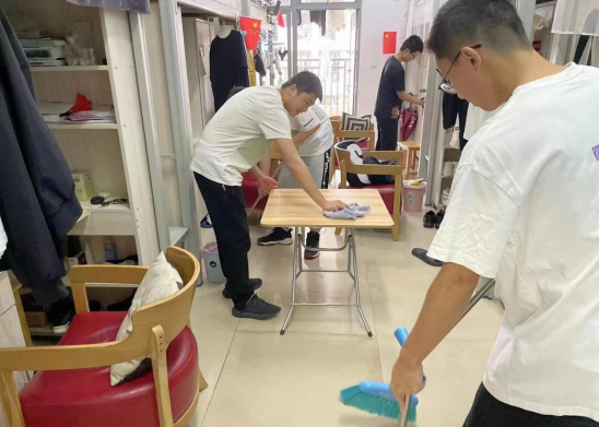 主题班会结束后,全班同学立即开展了劳动实践活动——打扫整理生活区,挽起袖子、拿起工具,或刷卫生间、或整理床架书柜、或打扫宿舍走廊,在大家齐心协力的努力下,原本污渍斑斑的卫生间变得整洁光亮,宿舍物品摆放井然有序,窗户玻璃干净明亮起来,一个整洁的生活环境呈现在同学们面前。