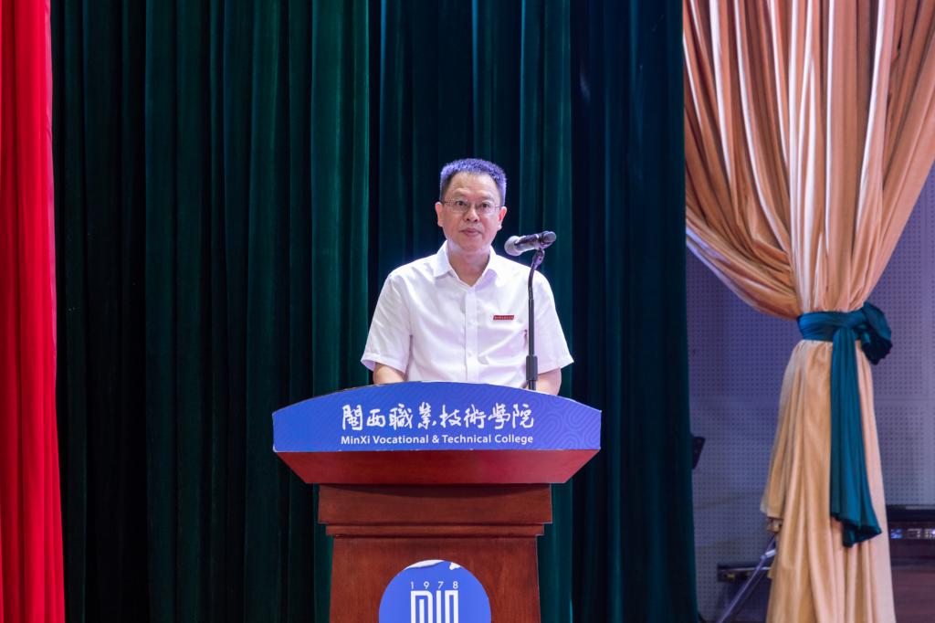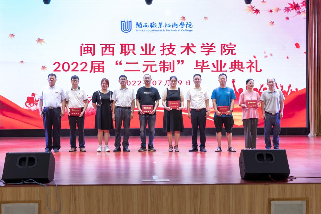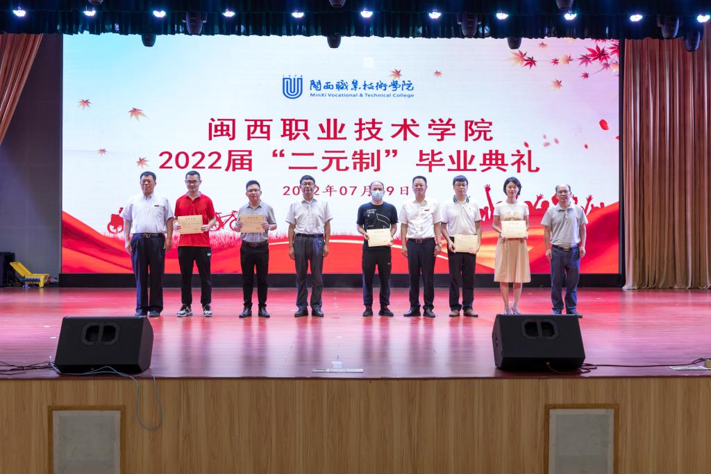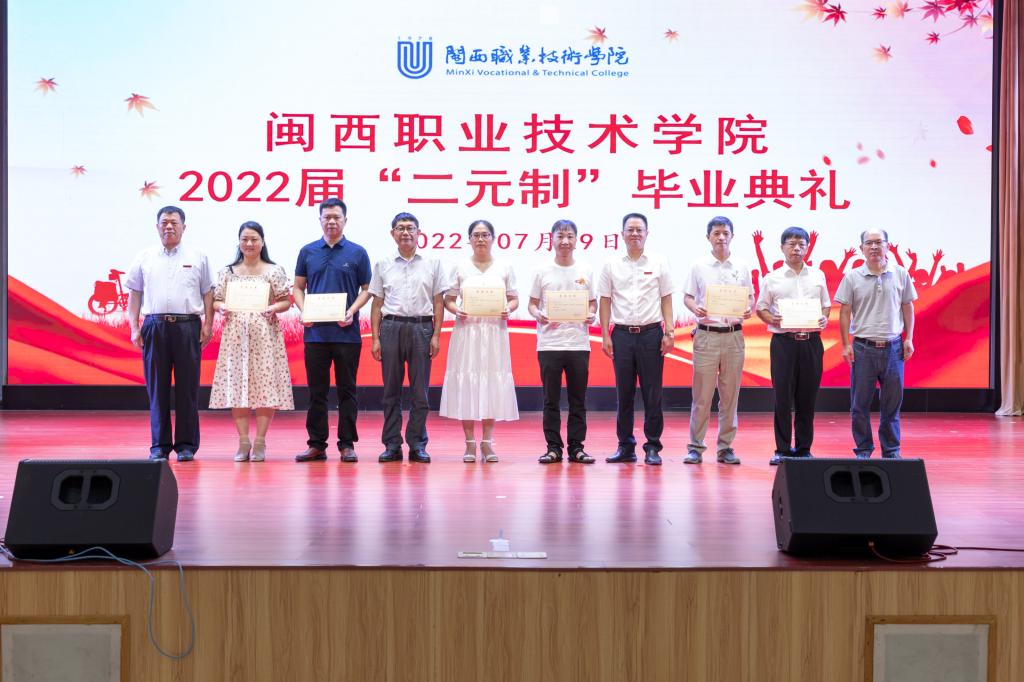 典礼在庄严的国歌声中拉开帷幕。会上,吴新业副校长宣读了二元制优秀毕业生的表彰决定,药学专业毕业生邓晶、信息与制造学院林福教授、福建龙麟集团有限公司副总经理黄永生分别代表毕业生、授课老师、合作企业进行了发言。