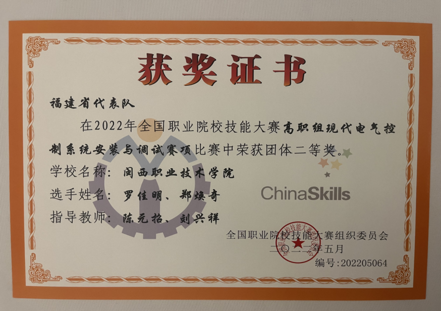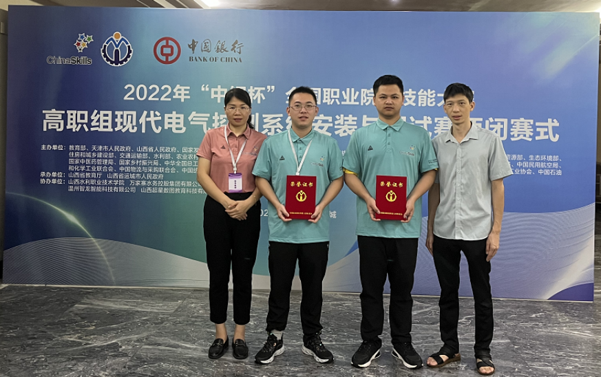 8月13日, 2022年度全国职业院校技能大赛“现代电气控制系统安装与调试”赛项在山西运城开赛,各省市共选派出57个优秀代表队同场竞技,经过两天艰苦而激烈的角逐,MG冰球2019级电气自动化技术专业学生罗佳明、郑焕奇以及指导教师陈元招、刘兴祥组成的代表队荣获国赛二等奖的好成绩。