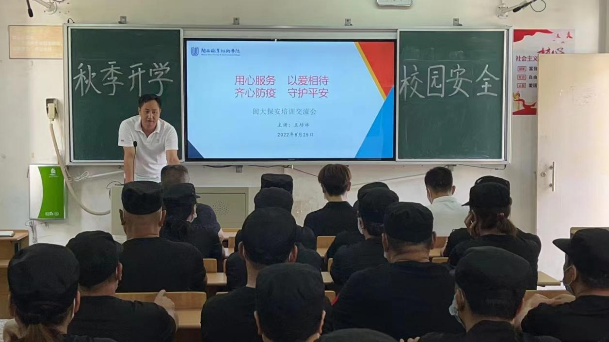安全保卫处王培林副教授以“用心服务 以爱相待 齐心防疫 守护平安”为题作了专题讲座。他从“团结一心”“认真履职”“文明友爱”“防控疫情”“平安闽大”等五个方面作了分享,为安保人员上了一堂通俗易懂,案例实用,图文并茂,内容丰富的讲座。