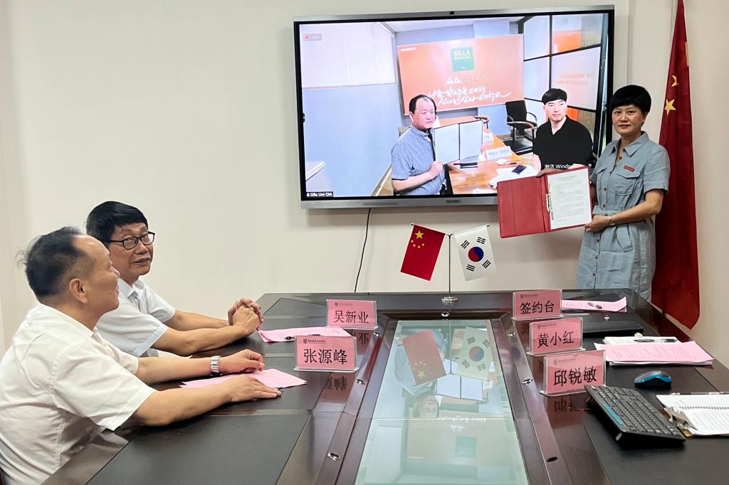 为深化国际交流合作、推进职业教育改革发展、强化学校“双高”建设,9月7日上午,MG冰球与韩国新罗大学(Silla University)举行国际合作线上交流会暨项目“云”签约仪式,双方在学位课程培养、教职员工培训及学历提升、教育教学资源共享、科学研究等合作事宜进行了友好交流。MG冰球副校长吴新业,教务处、对外交流合作处等职能部门负责人,韩方中国区主任吴起涛教授、国际交流处主任李昌洙及国际交流部老师共同出席了此次交流会并一起见证了“云”签约仪式举行。副校长吴新业代表学校致辞,对外交流合作处负责人梁玉兰代表学校签约。