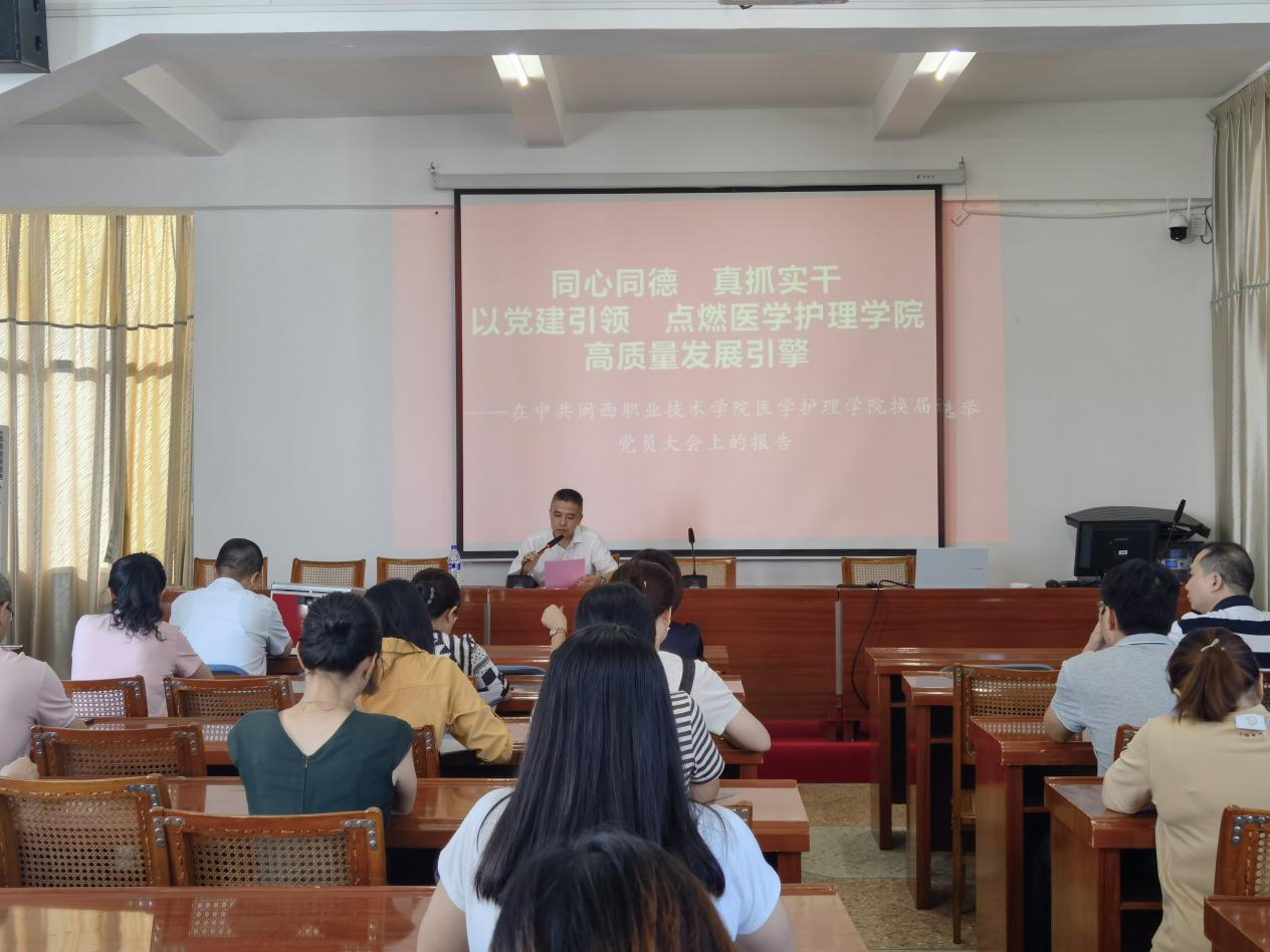 大会在庄严的国歌声中拉开帷幕。邱伟彬代表学院本届党委作题为《同心同德 真抓实干以党建引领点燃医学护理学院高质量发展新引擎》的工作报告。他表示,五年来,在校党委的正确领导下,院党委切实担负管党治党、办院兴院的政治责任,全面贯彻党的教育方针,牢牢把握社会主义办学方向,落实立德树人根本任务,深化推动“3355赋能型”党建品牌创建,不断夯实基层党建工作,团结和依靠广大党员和教职工,落实学校各阶段布置的建设目标和任务,聚焦内涵建设,学院不断整合资源、探索发展新路径,整体办学水平和实力显著提升。同时指出,目前学院的党建工作存在的不足及面临的困难和挑战,提出下一步奋斗目标,重点抓好四个全面,一是全面推进“双高”建设,是学校当前和今后一段时期的“重中之重”,也是学院实现高质量发展落实赶超的关键;二是全面深化改革,推进融合发展,为创建龙岩卫生职业技术学院做好准备;三是全面依法治院,持续完善学院内部治理的规章制度、方案举措,努力沉淀、培养、丰富和稳定具有医护特色文化和品牌;四是全面从严治党,加强党的建设,将党的建设摆在首位,加强理论武装,提高建设水平,持之以恒加强作风建设和纪律建设,推动从严治党向基层延伸,以优良的党风正校风、严师风、促学风,营造风清气正的政治生态。