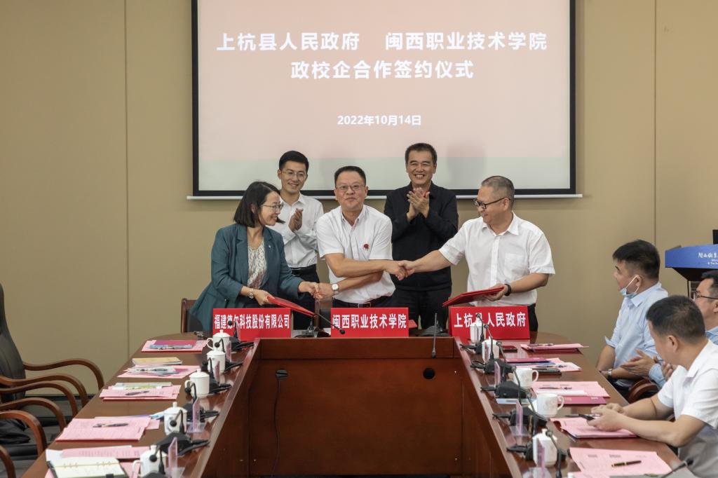 随后,校长梁俊平、上杭县副县长卢家荣分别与福建德尔科技股份有限公司、福建紫金锂元材料科技有限公司、福建常青新能源科技有限公司、时代思康新材料有限公司、福建晶旭半导体科技有限公司等5家企业负责人签订校、政、企合作协议,其他与会领导共同见证了签约仪式。