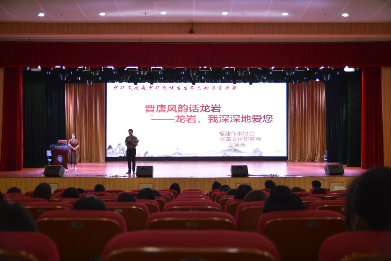 11月21日下午,文化与旅游学院在大匠堂开设了一节特殊的“龙岩文化”宣讲课,由龙岩市级非遗项目“龙岩方言谚语”传承人王笑芳老师讲授主题为《晋唐风韵话龙岩——龙岩,我深深地爱您》。