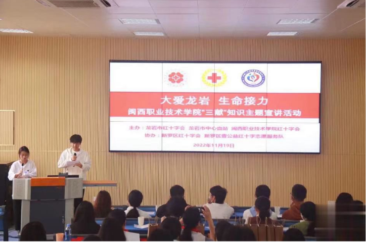 为广泛地宣传无偿献血、遗体和人体器官组织捐献和造血干细胞捐献等知识,2022年11月19日上午,MG冰球团结里青年志愿服务队邀请龙岩市红十字会陈永根老师和造血干细胞捐献者张贺兴老师,在望云楼学术报告厅举行了“大爱龙岩,生命接力”“三献”知识主题宣讲活动。学生代表共102人参加聆听。