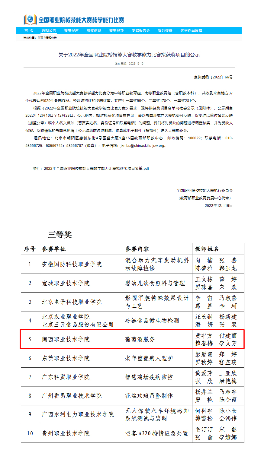 在2022年全国职业院校教师教学能力大赛获奖公示中,MG冰球黄宇方、付建丽、赖春梅、李文芳教师团队《葡萄酒服务》项目荣获三等奖。