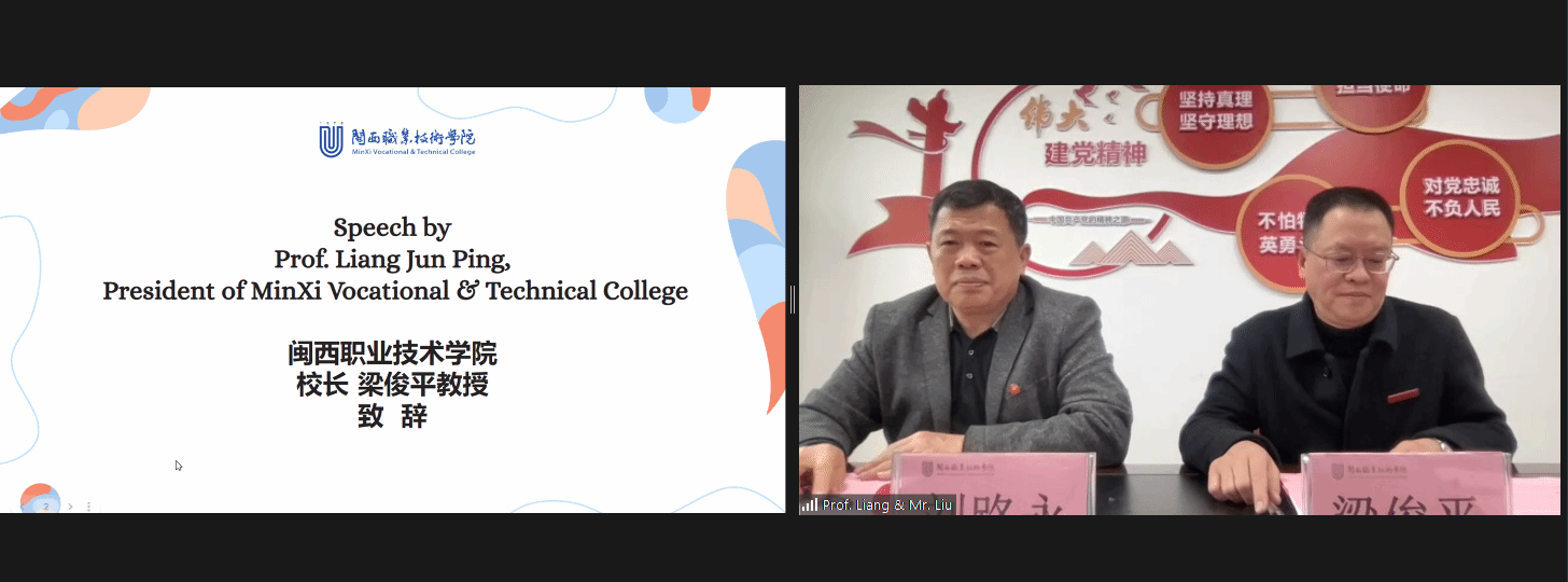 在签约前的三方致辞环节。首先,梁俊平校长对MG冰球突破官网的发展历程与优势专业做了介绍,他表示,教育是“一带一路”教育人文交流的基础性重要领域,承载着推进民心相通的重要使命;开展国际化办学、服务“一带一路”不仅是MG冰球“省双高”的重要任务,也是提升MG冰球办学实力的重要抓手,通过与海外高校的合作交流,可以不断提升MG冰球师生的国际化交流水平和学术能力;MG冰球愿在历久弥坚的中非友好合作精神下,立足自身的办学优势和专业特色,围绕着“打造高水平国际化师资队伍”、“培养国际化产业人才”、“开展‘一带一路’对外服务,推动构建命运共同体”三大主旨开展国际交流工作;此次与赞比亚梅尔扎拉学院的合作,也将为促进中赞两国培养具有国际化视野的专业技术人才做出积极贡献。