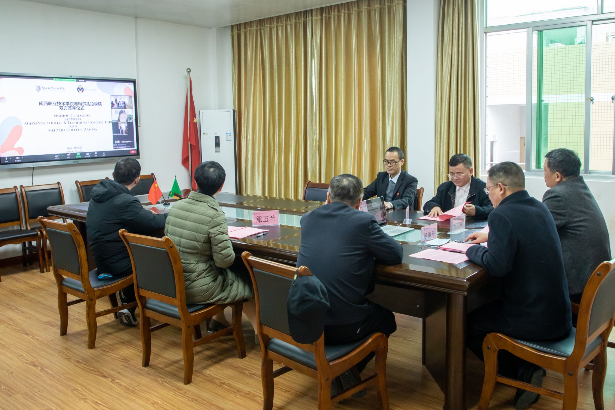 致辞环节结束后,在友好热烈的氛围中,在各方的见证下,刘路永副校长与赞比亚梅尔扎拉学院代表易卜拉欣-奥兰亚博士正式签署了校际合作意向书,标志着双方院校就师生交流、课程合作、学术合作、科研合作等方面达成合作意向。