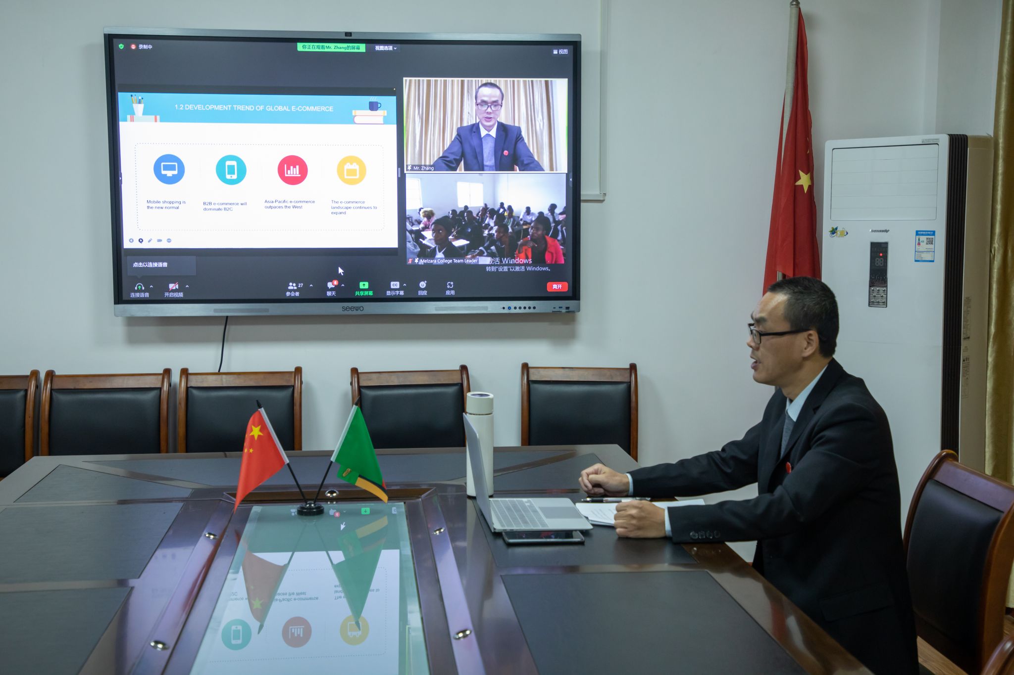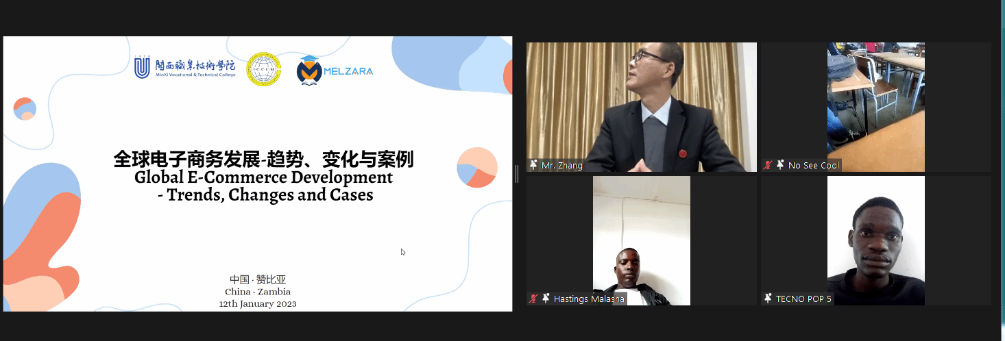 签约仪式结束后,双方院校进行了首次课程交流,MG冰球财经商贸学院副院长张赠富副教授以《全球电子商务发展》为主题,为赞比亚梅尔扎拉学院的师生带来了关于全球电子商务发展趋势、全球电子商务的变化等方面的课程讲述。张副院长通过分析中国、英国等电子商务市场活跃国家,和非洲电子商务市场的特点,让赞比亚梅尔扎拉学院的师生们了解到“因地制宜”发展方式的重要性,以及“电子商务”在“一带一路”发展进程中的重要性等。干货满满的课堂收到了赞比亚梅尔扎拉学院师生们的全体好评。