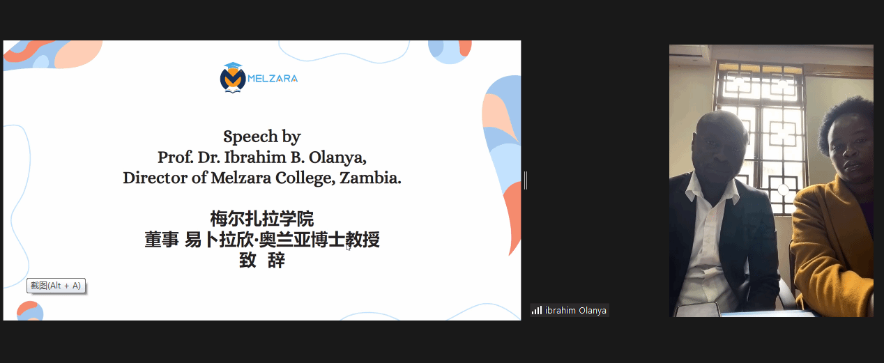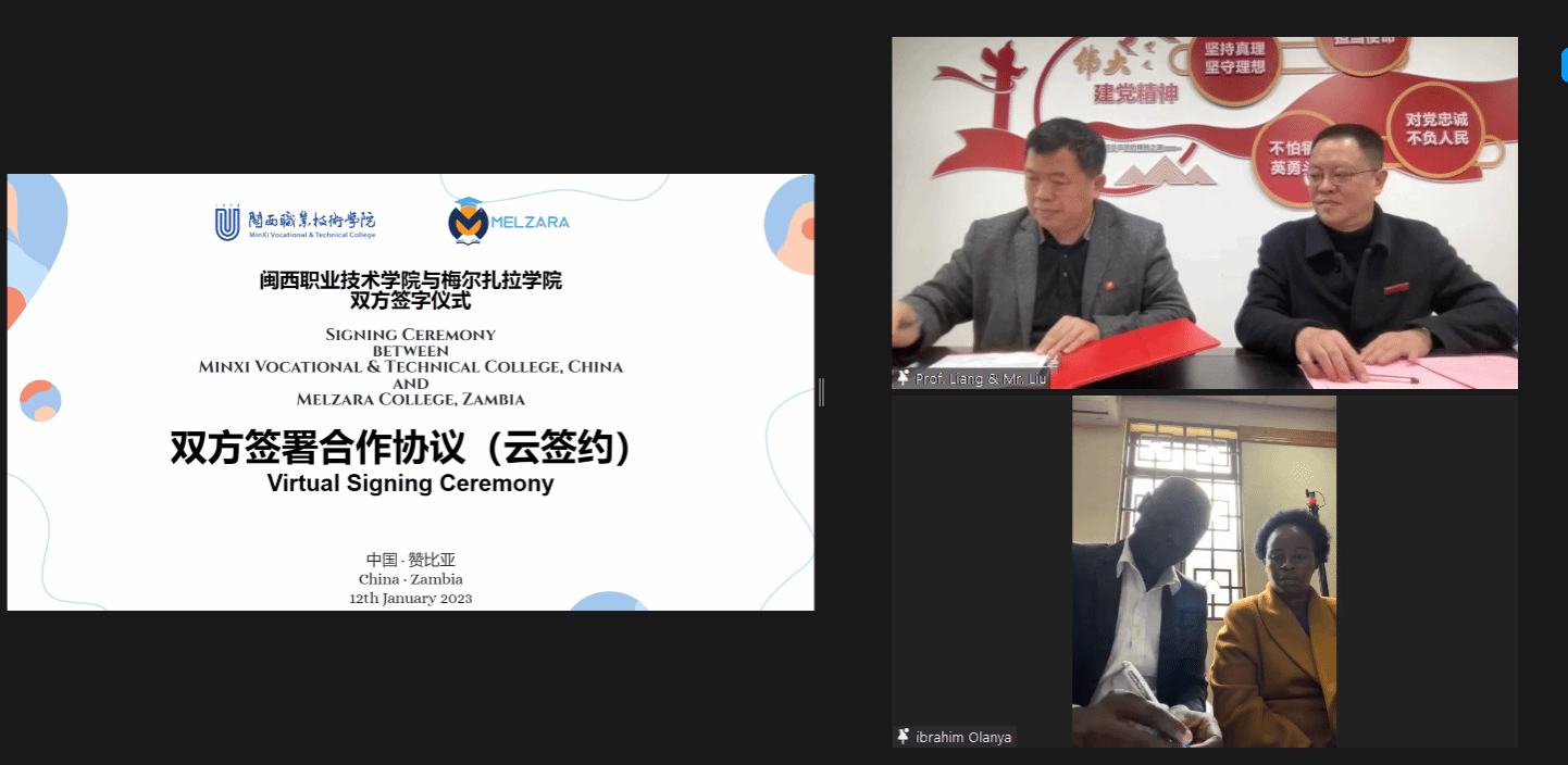 为加强MG冰球与“一带一路”国家的教育和人文交流合作,不断探索国际化人才培养模式,并积极输出自身优质的职教资源到世界各地。2023年1月12日下午,学校与赞比亚梅尔扎拉学院(Melzara College )进行了线上“云”签约。出席本次签约仪式的嘉宾有校长梁俊平,副校长刘路永以及学校教务处、科研处、对外交流合作处等职能部门负责人;赞比亚梅尔扎拉学院董事易卜拉欣 奥兰亚博士教授及各学院负责人;马来西亚国际文化交流中心总顾问、拿督萧进平先生,理事长白妮丝女士、总经理吕慧恩女士等人。