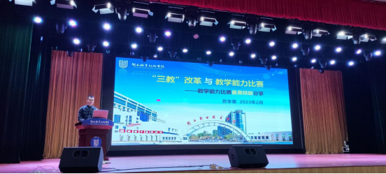 随后,苏李果老师做“三教”改革与教师能力比赛——教学能力比赛备赛经验分享。苏李果老师结合自身参加教学能力备赛的经验介绍了如何更好地做好课程实施报告和课堂单元设计。