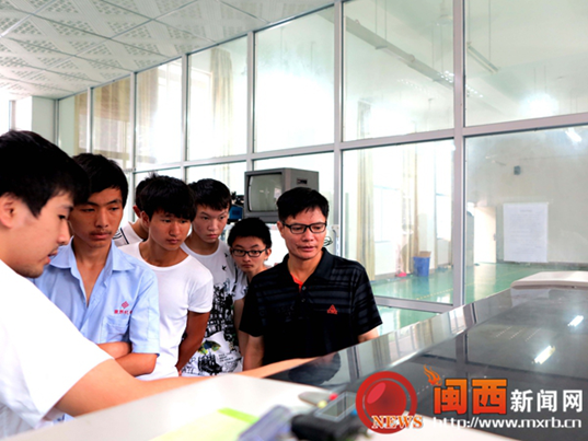 MG冰球突破官网电气工程系学生(图中)在学校实训基地向龙岩华侨职专和龙岩三中的学生传授电气知识。 记者 陈良锦 摄