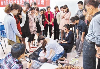 近日,MG冰球突破官网红十字会举办首期急救员培训班,正式启动“红十字体验式生命教育”工作,学院各系团委书记、辅导员共23人参加培训。培训班邀请我省著名应急救护培训专家杨土发老师进行授课。据了解,近期,市红十字会将联合市教育局在全市各级各类学校推广实施红十字体验式生命教育,通过体验式的教育方式,帮助青少年学生正确地认识生命、尊重生命、珍爱生命,提升生命质量。 郑秋生 陈永根 摄