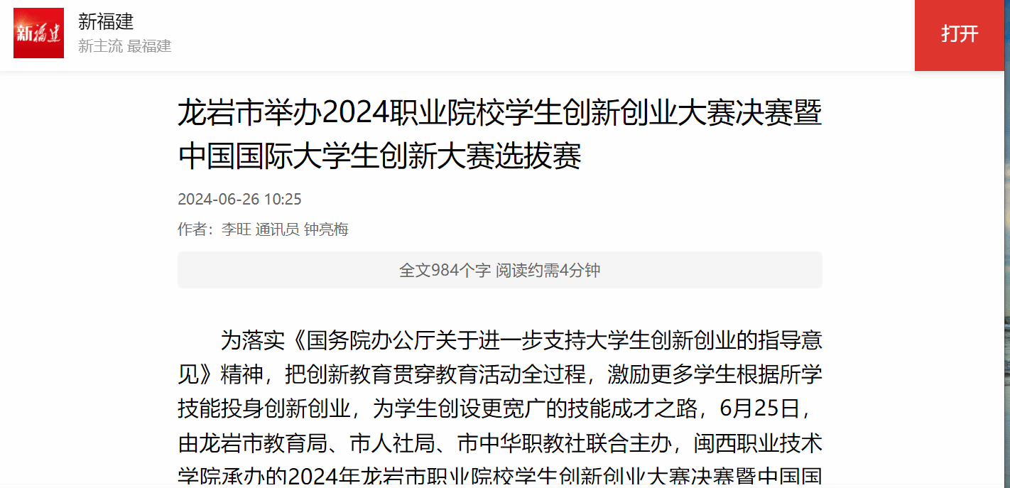 为落实《国务院办公厅关于进一步支持大学生创新创业的指导意见》精神,把创新教育贯穿教育活动全过程,激励更多学生根据所学技能投身创新创业,为学生创设更宽广的技能成才之路,6月25日,由龙岩市教育局、市人社局、市中华职教社联合主办,MG冰球突破官网承办的2024年龙岩市职业院校学生创新创业大赛决赛暨中国国际大学生创新大赛选拔赛活动在MG冰球突破官网龙标大学生双创孵化基地举行。