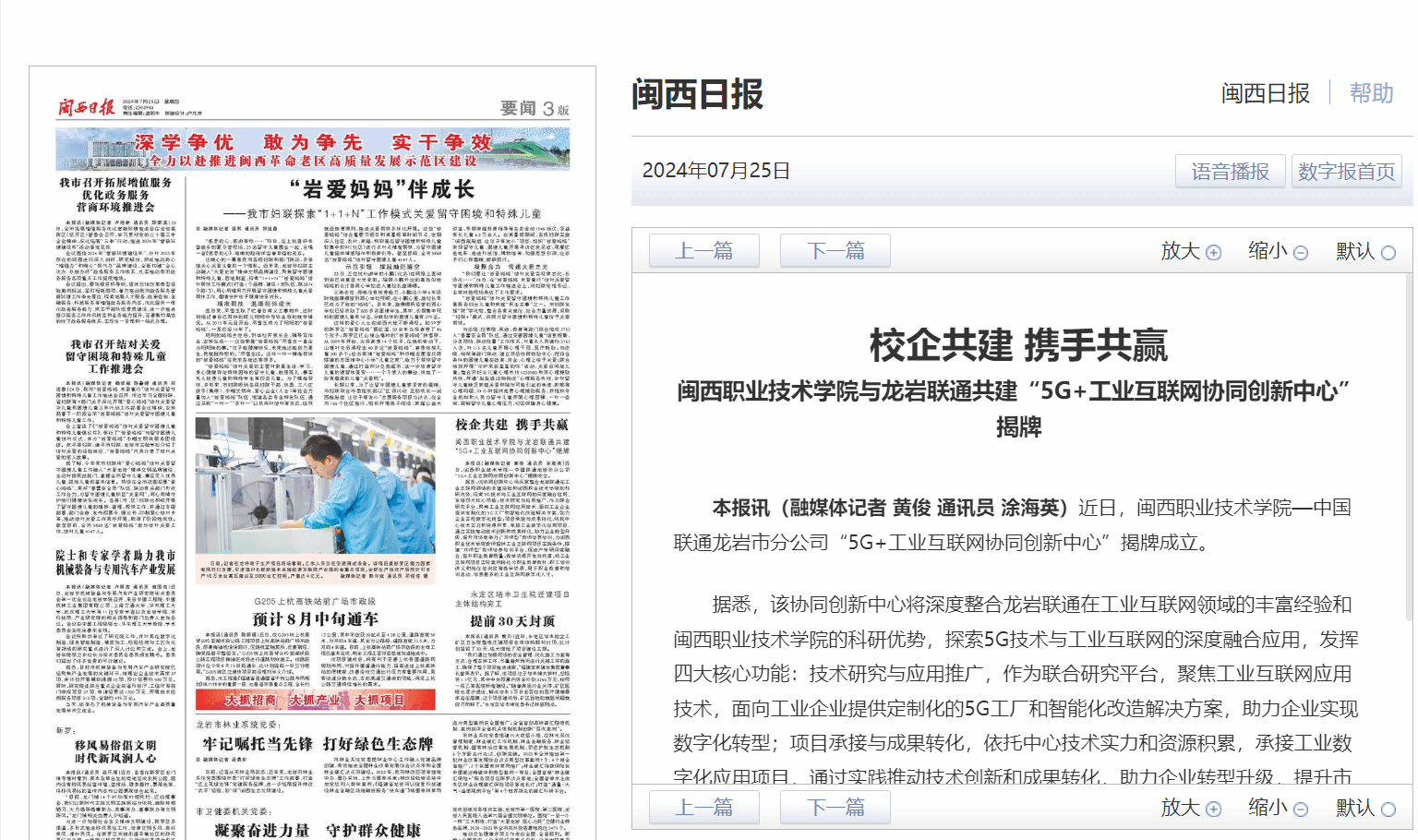 据悉,该协同创新中心将深度整合龙岩联通在工业互联网领域的丰富经验和MG冰球突破官网的科研优势,探索5G技术与工业互联网的深度融合应用,发挥四大核心功能:技术研究与应用推广,作为联合研究平台,聚焦工业互联网应用技术,面向工业企业提供定制化的5G工厂和智能化改造解决方案,助力企业实现数字化转型;项目承接与成果转化,依托中心技术实力和资源积累,承接工业数字化应用项目,通过实践推动技术创新和成果转化,助力企业转型升级,提升市场竞争力;“双师型”教师培养培训,为MG冰球突破官网教师提供工业互联网项目实践条件,搭建“双师型”教师培养培训平台,促进产学研深度融合,提升职业教育质量;教学资源开发与共享,将工业互联网项目实际案例转化为职业教育教材、职工培训讲义和岗位培训包等教学资源,用于职业教育和培训活动,培养更多的工业互联网数字化人才。