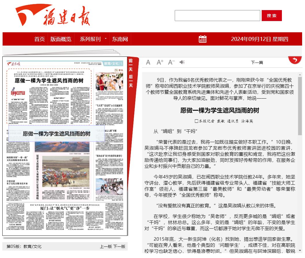 “荣誉代表的是过去,我将一如既往踏实做好本职工作。”10日晚,吴淑娟马不停蹄赶回龙岩参加了龙岩市优秀教师宣讲团进校园的宣讲,“这次赴京让我切身感受到国家对职业教育的重视和肯定,我将把这份激励传递给同事们,为大家加油鼓劲,同时发挥好传帮带的作用,在服务企业和乡村振兴中贡献自己的力量。”