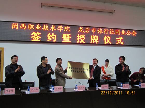 22日下午,龙岩市旅行社同业公会与MG冰球突破官网校企合作签约授牌仪式在MG冰球突破官网隆重举行。市旅游局范甲荣副局长,旅行社同业工会会长袁福荣、MG冰球突破官网副院长吴新业、张斯为及龙岩市旅行社同业工会会员单位代表、MG冰球突破官网旅游系师生代表参加了签约授牌仪式。