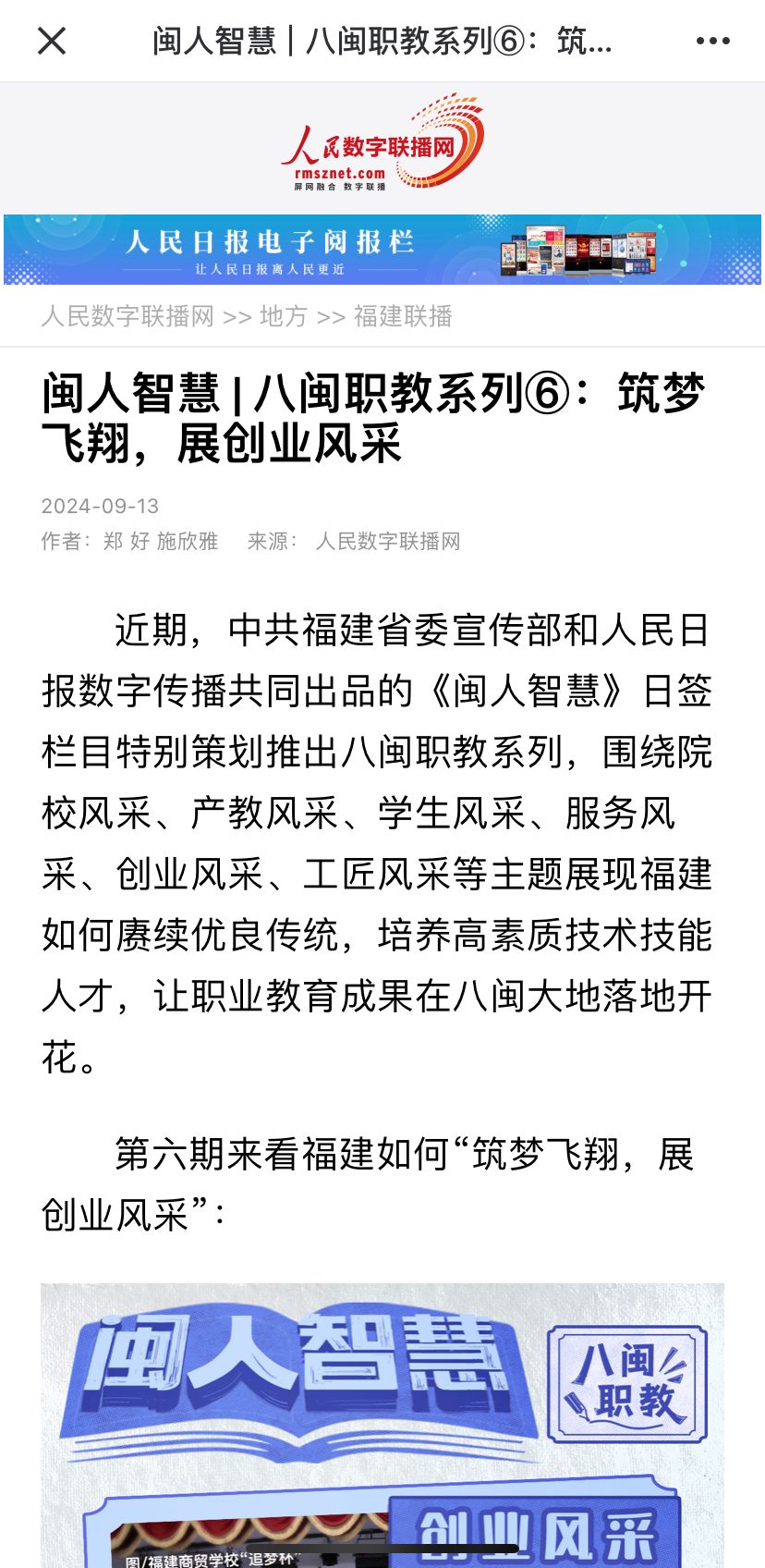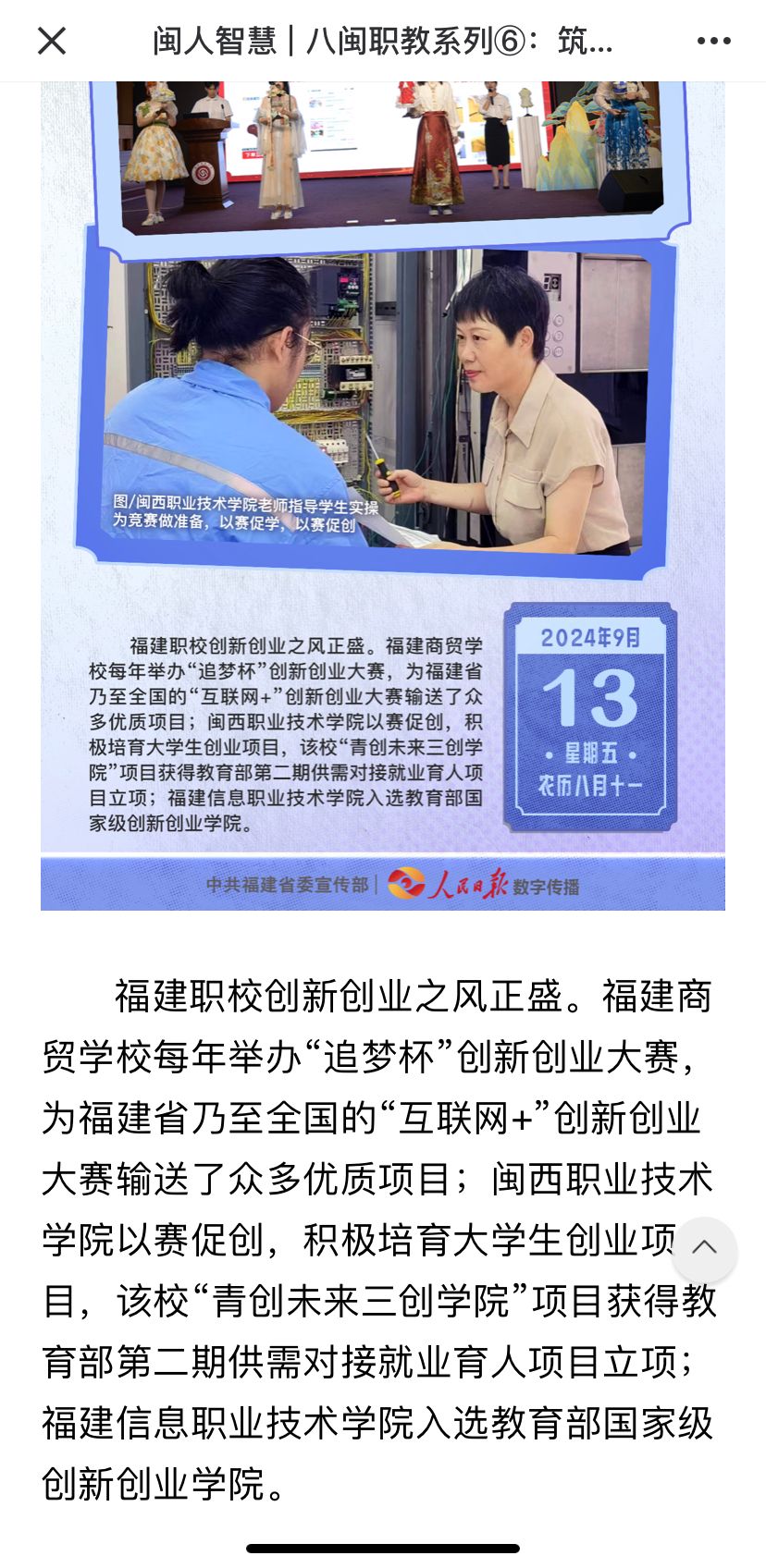 近期,中共福建省委宣传部和人民日报数字传播共同出品的《闽人智慧》日签栏目特别策划推出八闽职教系列,围绕院校风采、产教风采、学生风采、服务风采、创业风采、工匠风采等主题展现福建如何赓续优良传统,培养高素质技术技能人才,让职业教育成果在八闽大地落地开花。