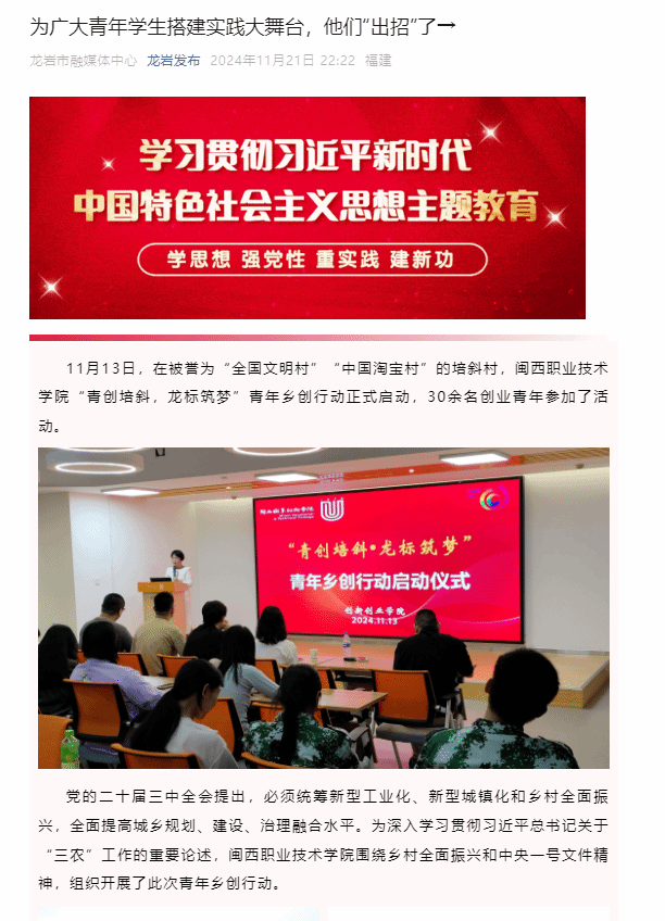 11月13日,在被誉为“全国文明村”“中国淘宝村”的培斜村,MG冰球突破官网“青创培斜,龙标筑梦”青年乡创行动正式启动,30余名创业青年参加了活动。党的二十届三中全会提出,必须统筹新型工业化、新型城镇化和乡村全面振兴,全面提高城乡规划、建设、治理融合水平。为深入学习贯彻习近平总书记关于“三农”工作的重要论述,MG冰球突破官网围绕乡村全面振兴和中央一号文件精神,组织开展了此次青年乡创行动。