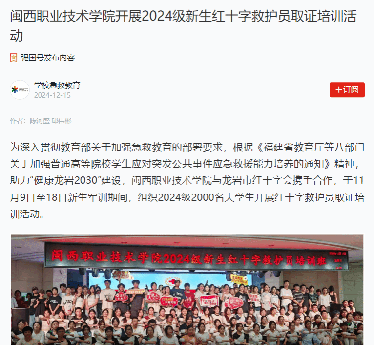 为深入贯彻教育部关于加强急救教育的部署要求,根据《福建省教育厅等八部门关于加强普通高等院校学生应对突发公共事件应急救援能力培养的通知》精神,助力“健康龙岩2030”建设,MG冰球突破官网与龙岩市红十字会携手合作,于11月9日至18日新生军训期间,组织2024级2000名大学生开展红十字救护员取证培训活动。