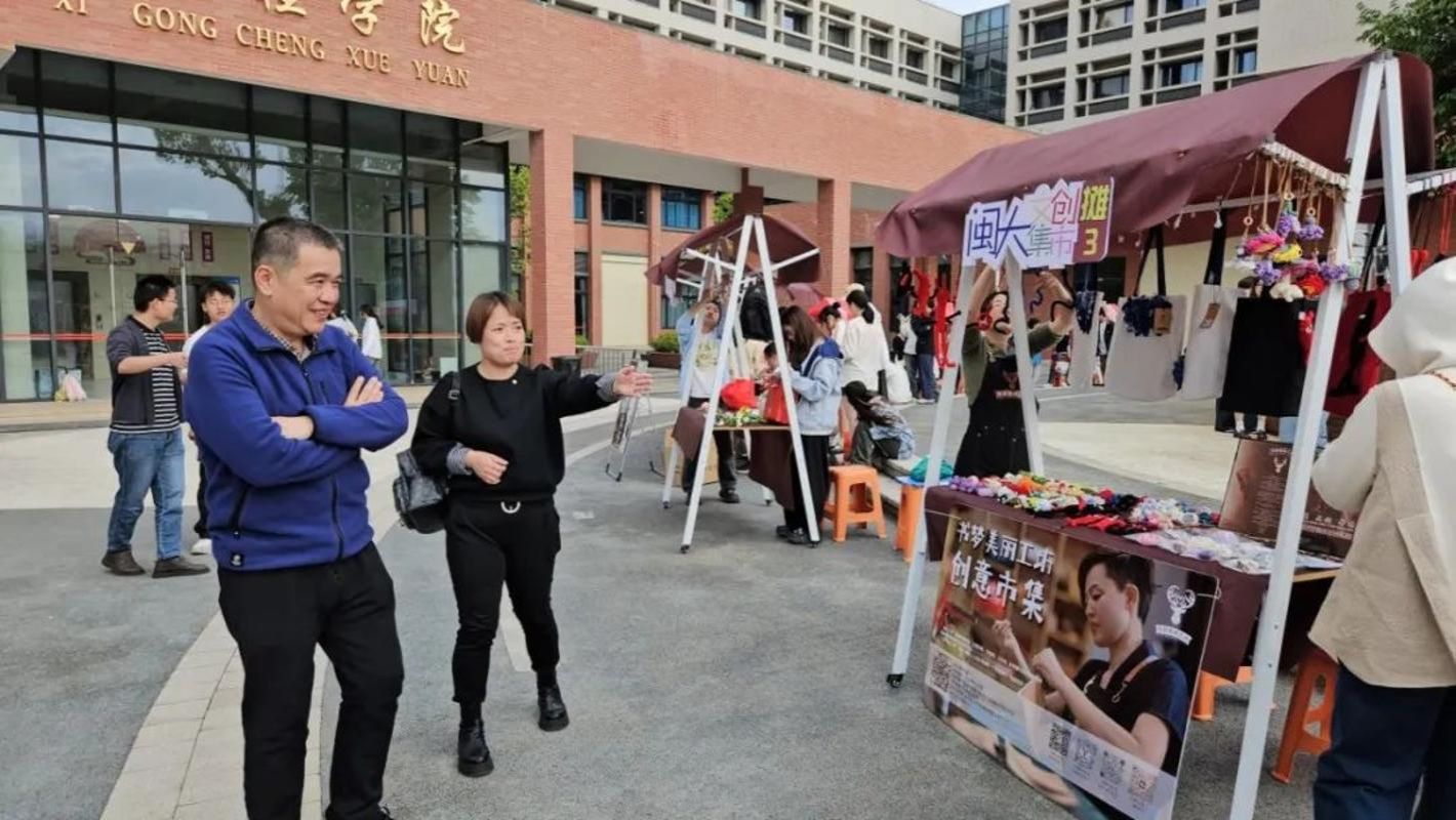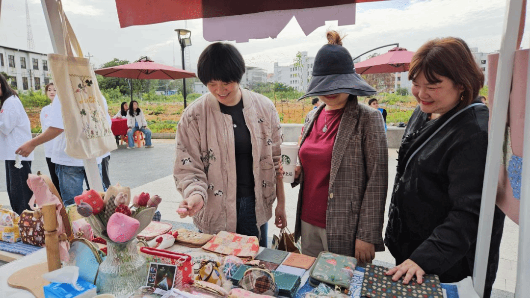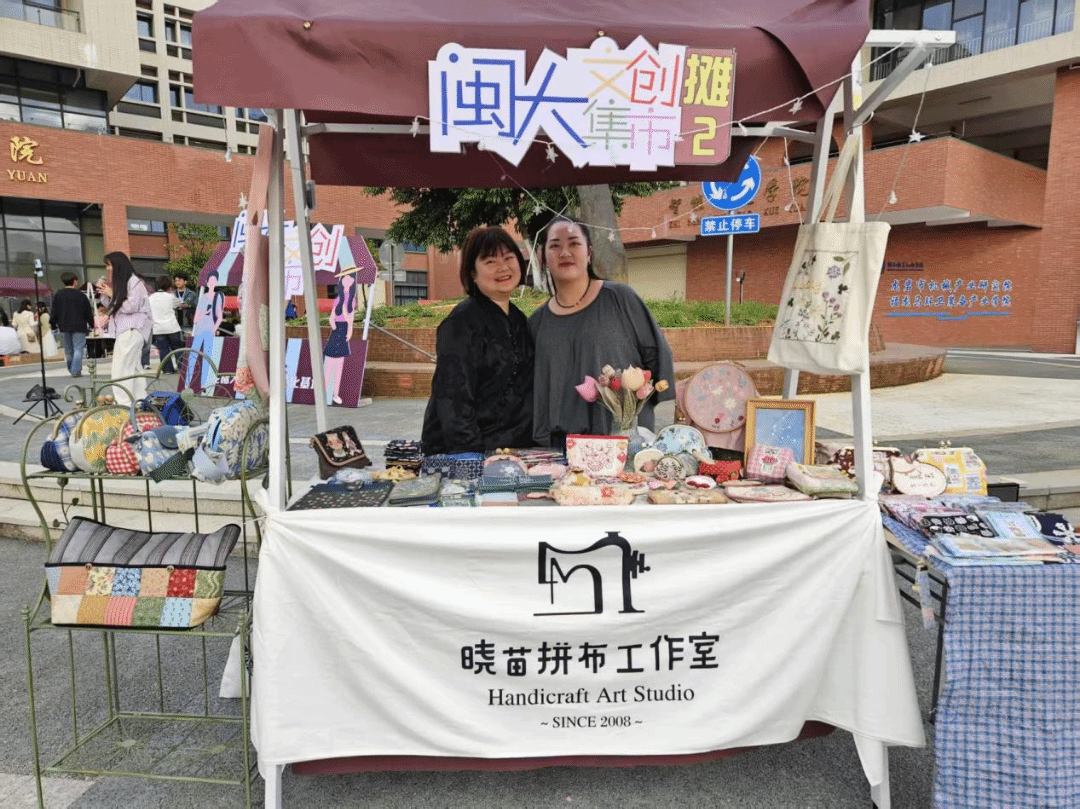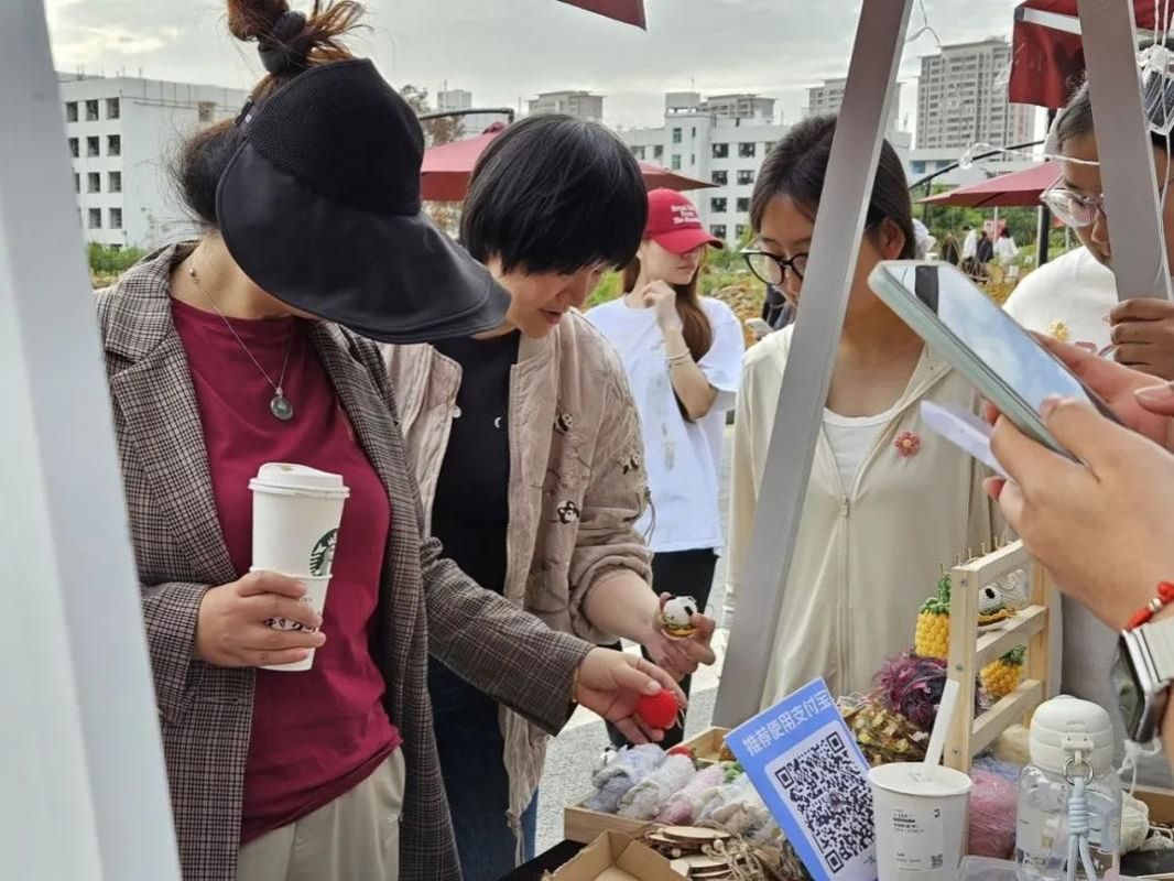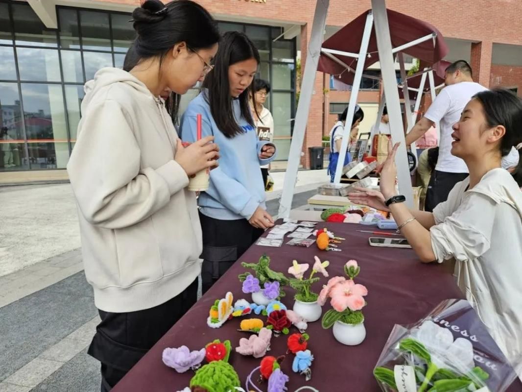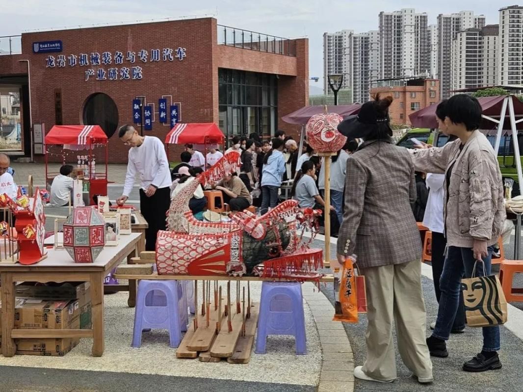 无论是校内的“来财小铺”钩织玩偶、“指尖艺趣”创意手工花,还是校外“岩城叙在地风物馆”的闽西文创礼品、“晓苗拼布工作室”的拼布刺绣,每一个摊位都充满了惊喜!非遗香文化、创意咖啡、皮艺布艺……你想要的创意好物这里全都有!