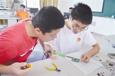 7月10日上午,MG冰球突破官网的实训基地迎来了一群特殊的客人——来自永定区的6名中学生孤儿,他们正在学生哥哥的指导下,尝试自己动手制作收音机。